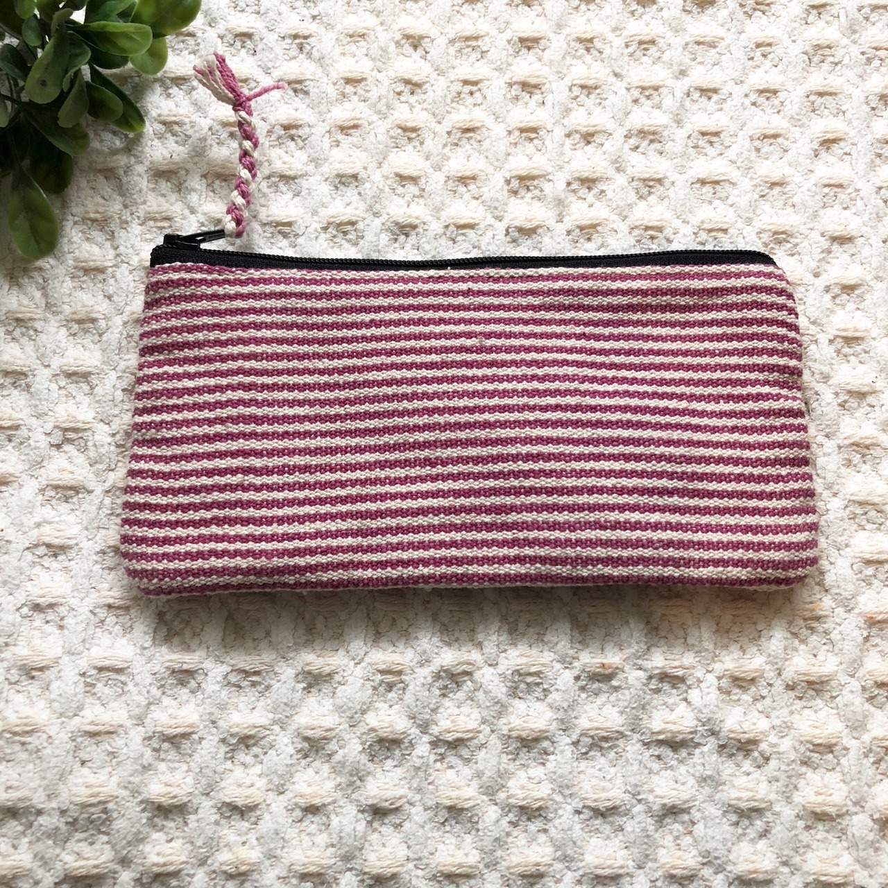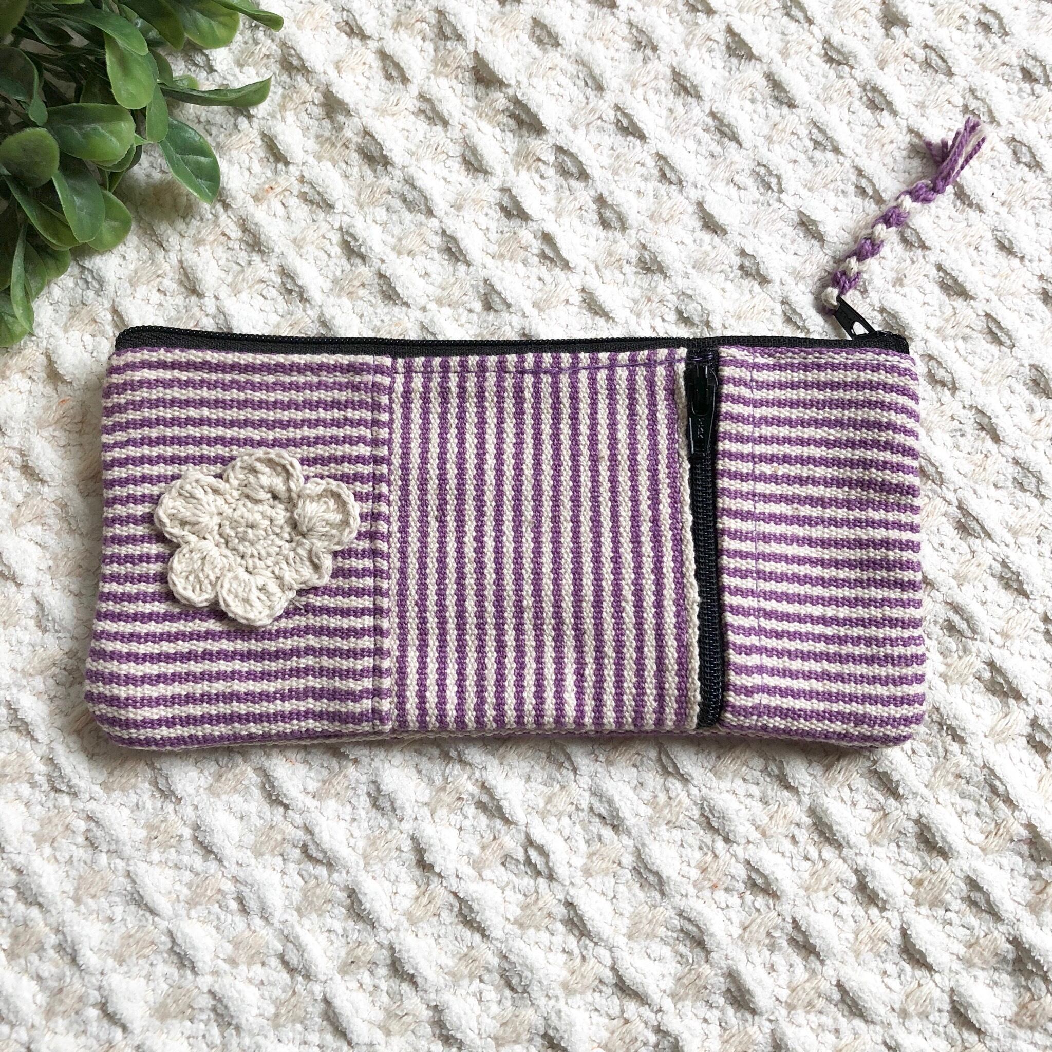 花付きポーチ ストライプ柄になります。手織りのハンドメイドです。