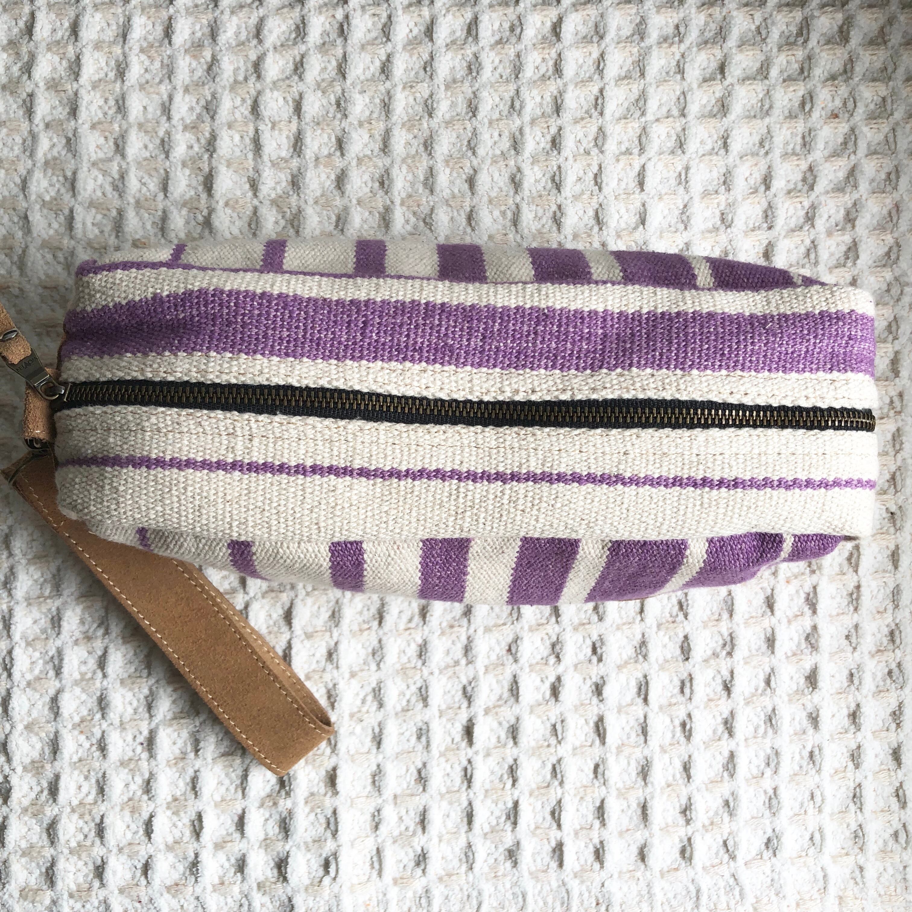 手織り布と柔らかい牛革の組み合わせが特徴です。牛革のストラップが付いるのでバックに入れる時以外にポーチ単独で持つ時も使いやすいです♡マチも広いので見た目以上に大容量です♡